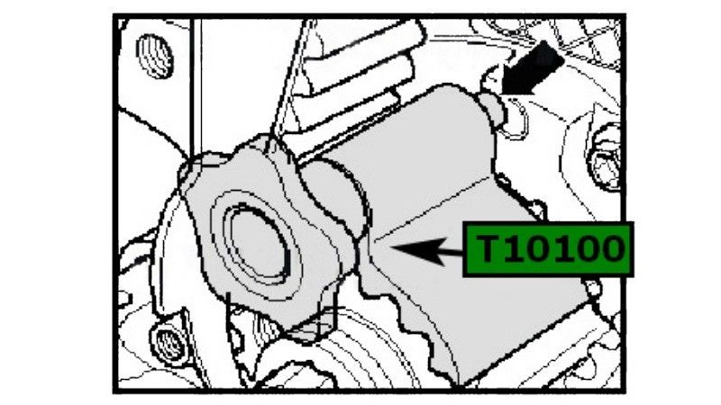 Специальным приспособлением AI010069A (VAG T10100) зафиксируйте шкив зубчатого ремня коленчатого вала, при этом метка на шкиве должна совместиться с указателем на приспособлении. При установке приспособления AI010069A (VAG T10100) его выступ должен войти в паз блока цилиндров, как показано на рисунке.