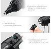 Корпус пистолета изготовлен из ударопрочного термостойкого пластика. Эргономичная двухкомпонентная рукоятка обеспечивает комфортную работу при длительном использовании. Металлическое сопло защищено силиконовой накладкой. На рукоятке пистолета имеется выключатель для переведения инструмента из рабочего положения в режим ожидания. Имеет встроенную, регулируемую и съемную подставку для установки в нерабочем положении.